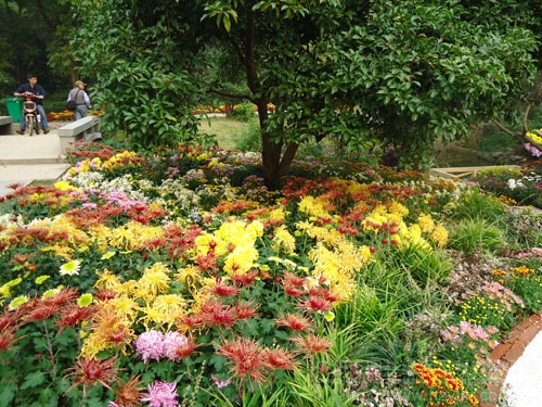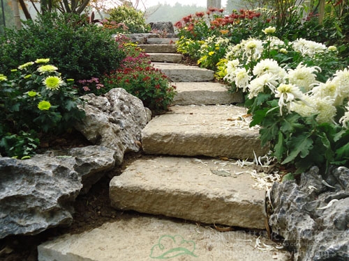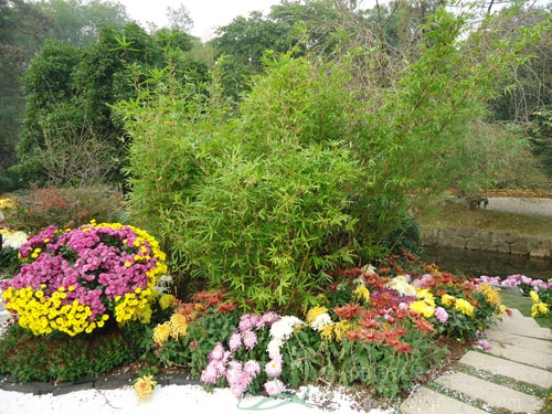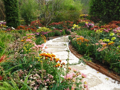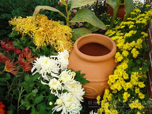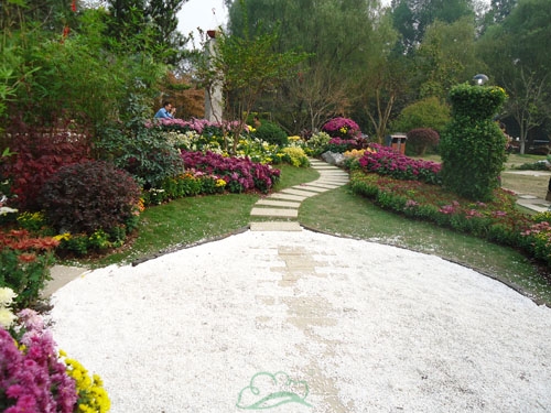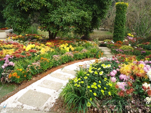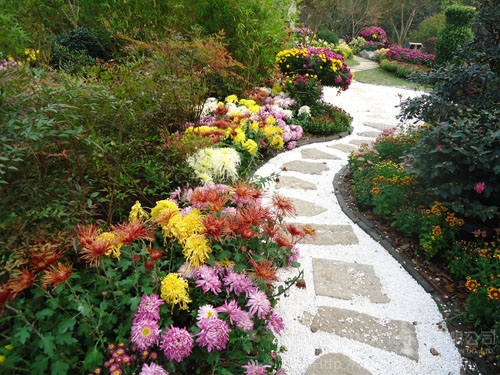 蜿蜒的園路、白色的石子、紅色的陶罐、盛開的菊花
