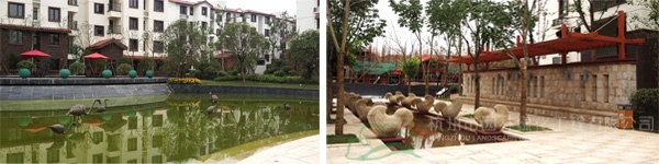 在紫荊東郡小區(qū),水景隨處可見,從主入口兩側(cè)近50米的景觀橋水景,到入口正前方一個(gè)大型的石雕噴泉,再到小區(qū)里面幾條主干道交匯的十字路口的小型地面噴泉,中心水景上的圓形石雕噴泉,特別是不遠(yuǎn)處的動物噴泉雕塑,只只鶴低頭凝思,細(xì)長的水流從鼻端的出水口處流出,落入下方的水池里,更是格外引人注目?!斑@些水景小品具有的藝術(shù)特性與審美效果,加強(qiáng)了整個(gè)景觀環(huán)境的藝術(shù)氛圍,成為讓空間環(huán)境生動起來的關(guān)鍵因素,在提高小區(qū)藝術(shù)品質(zhì)和景觀形象的同時(shí),更給人們帶來美的享受?!睏罱?jīng)理如是說。