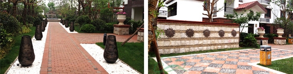 據(jù)楊經(jīng)理介紹,紫金東郡小區(qū)里的鋪裝材料主要以橙紅色的燒結(jié)磚和仿古磚為主,燒結(jié)磚具有承重量大和隔聲性強(qiáng)的特點(diǎn),是小區(qū)園路鋪裝的優(yōu)良選擇,此外,紅色又與建筑的整體色調(diào)相搭配,有種渾然一體的效果感;而仿古磚除了具有防水、防滑、耐磨等特性外,還具有獨(dú)特的古典韻味,更能營造出歲月的滄桑和厚重感。在鋪裝方式上,有的是道路中間用橙紅色的燒結(jié)磚,兩邊鋪設(shè)白色的石子,營造一種居家庭院的溫馨感;有的是正方形的仿古磚與黑色的石子,一紅一黑,相映成趣;還有的用白色的仿古磚作道路兩側(cè)的點(diǎn)綴,風(fēng)格自成一體。純美的色彩、流暢的線條、些微的暖調(diào),不同的道路上別具特色的圖案,使人走上去踏實(shí)、安穩(wěn)而又感古樸、雅致,成為不斷蜿蜒的腳下風(fēng)景。