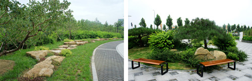 而在道路十字路口的節(jié)點處,則主要是用10cm×10cm的小花崗巖鋪地,鋪出來的路面整潔、平坦,看似簡單,實則對施工技術要求相當高。草坪中的地面鋪裝,則采用花崗巖汀步,用錯縫鋪裝法,兩塊花崗巖之間用草皮鑲嵌,就像給每塊花崗巖鑲了一道綠邊,與旁邊的草坪和諧地融為一體。貫穿整個工程的游憩步道,全部采用“人字形”的鋪裝方法,中間用透水磚、兩邊以花崗巖鑲邊,透水磚價格不高,用以鑲邊的花崗巖是利用了鋪裝中剩余的邊料,雖然用料簡單,但通過對技術的嚴格要求,鋪出的路面卻整潔而不失韻味,是一種實用、環(huán)保、節(jié)約的做法。