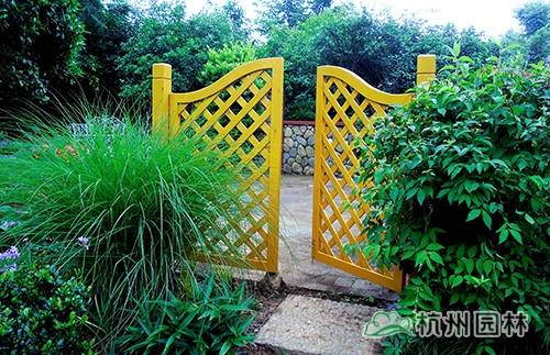 門口安裝高1.2m、寬1.5m的對開推入式木門,以此吸引游人眼球;花園入口采用常綠灌木、花灌木、宿根花卉相結(jié)合的手法,將花園內(nèi)的景觀進行了遮擋,同時營造出引人入勝的入口景觀。