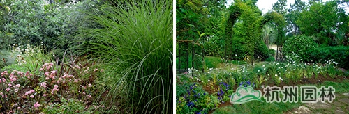 入口視線落腳點以粉黛亂子草+大濱菊花帶為中景,以紫絨鼠尾草+亞麻“紅劍”+微型月季“玫紅”為前景,在細葉芒的掩映下,將花園內(nèi)部形成若隱若現(xiàn)的效果;木香花架側(cè)采用花帶式種植,利用粉黛亂子草可達1.5m以上的枝葉進行空間分割,形成既與周圍環(huán)境風(fēng)格統(tǒng)一又相對私密的花園獨立空間。并采用大濱菊做邊緣隔離、金線石菖蒲做填充,既限定了粉黛亂子草的生長區(qū)域,又增加了景觀多樣性。