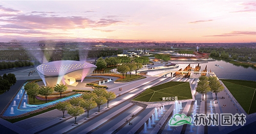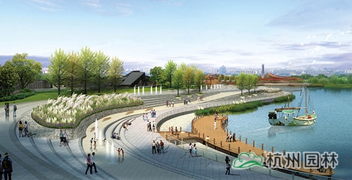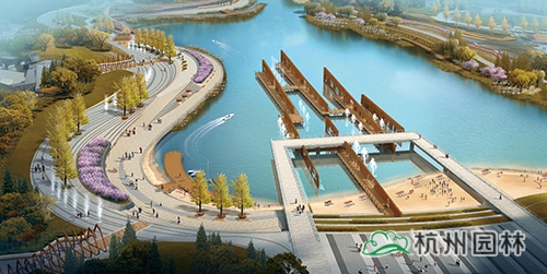 水岸廣場:臺地張弛有度,將臺階、坡道、草坪、木平臺、廣場組成豐富的濱水空間,流線型的岸線貫穿整個臺地,形成一條觀光濱水走廊,結(jié)合濱水岸線設置游船碼頭、親水平臺,形成極具特色的水岸廣場。