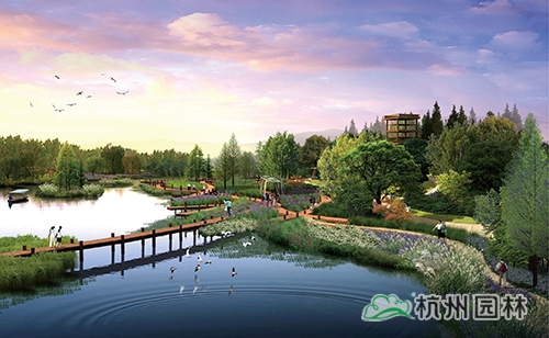 方案對原有坑塘進行綜合改造,由一系列下沉式綠地、景觀池塘形成雨水濕地,通過藝術(shù)化設計手法,大量運用開花地被與水生植物,形成迷人的雨水濕地,使其如同綠色海綿般,讓城市具有適應環(huán)境的彈性,保障城市生態(tài)安全。