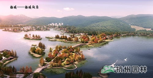 依據(jù)湘湖內(nèi)部自北向南的五堤,各堤路賦以色相植物,打造湘堤紫雨、越堤紅梅、楊堤秋染、長(zhǎng)堤金風(fēng)、賀堤碧玉。