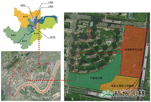 江干區(qū)東湖路市民公園位于東湖路與九喬街西南角,毗鄰九月庭院和泊林印象小區(qū),是江干區(qū)“一帶生態(tài)功能區(qū)”的“運(yùn)河—錢塘江—東湖路”U型生態(tài)軸的重要節(jié)點(diǎn)。結(jié)合已建成公園和高架互通施工預(yù)留地,對東湖路市民公園進(jìn)行統(tǒng)一規(guī)劃。