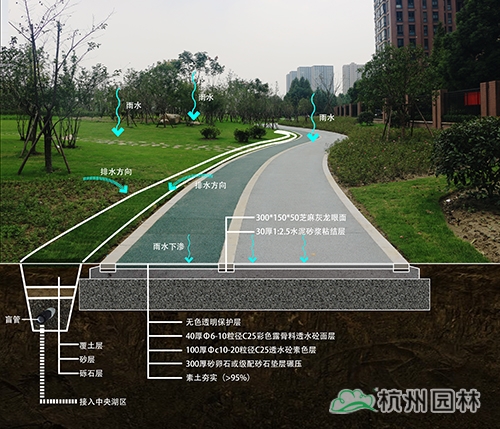 在東湖路市民公園中,采用了透水混凝土、透水砂石、透水卵石鋪裝。