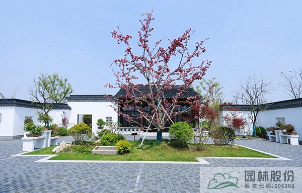 盆景園內(nèi),一棵棵造型別致的盆景,是海棠另一種形態(tài)的展現(xiàn)。院子中央,高大的‘豐盛海棠’正迎來盛花期,深粉色的花朵密密匝匝布滿枝頭,成為院中最引人矚目的風景,與院子里的五棵柿子樹搭配種植,組合成“五世同堂”的美好寓意,寓示著日子紅紅火火、闔家歡樂吉祥。在主建筑旁的天井處,采用盆景化的造園手法,運用南天竹、黑松、石子等元素營造的植物小景,自成一方小天地,與整個盆景園形成“園中園”的關系,展現(xiàn)出造園者的奇妙心思。
