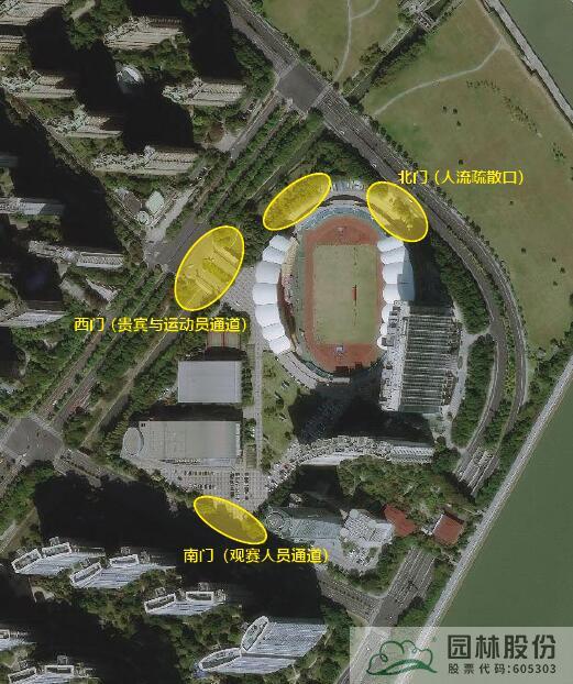 設(shè)計(jì)策略:對亞運(yùn)場館三個(gè)出入口進(jìn)行景觀提升,梳理中下層植被,布置足球主題裝置小品或綠雕,配合特色花境花帶和蒔花,打造活力、歡快、熱情的核心景觀氛圍。