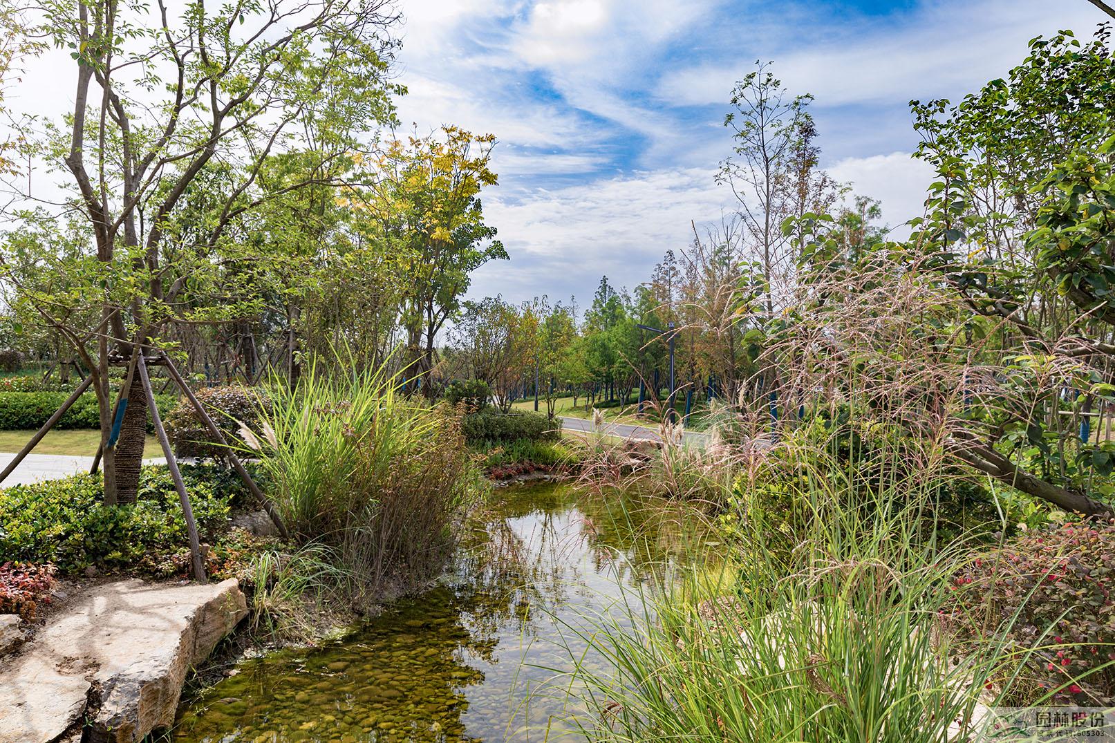 在地形與設(shè)施處理上,根據(jù)海綿匯水分區(qū)、設(shè)計(jì)調(diào)蓄容積等要求,結(jié)合現(xiàn)場(chǎng)實(shí)際情況,在北段沿線設(shè)置植草溝和人工濕地;南段結(jié)合現(xiàn)有地形,設(shè)置旱溪、濕塘、調(diào)解塘、自然式蓄水池等海綿設(shè)施。通過各類海綿設(shè)施收集、輸送、蓄存雨水,并利用水生、濕生植物及砂石土壤對(duì)雨水進(jìn)行截留和凈化,通過雨水下滲補(bǔ)充公園綠地土壤水分和地下水。
