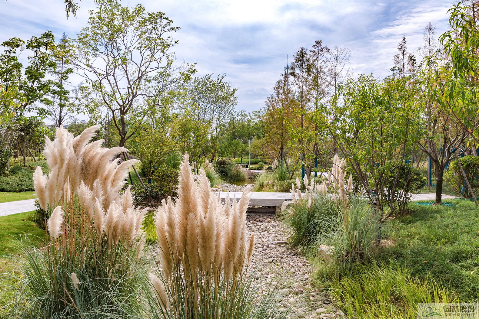 旱溪景觀同樣是海綿城市理念的應(yīng)用典范,下雨時(shí)蓄水,既可用于植物的日常澆灌,又能營(yíng)造出清新靈動(dòng)的水景;干旱時(shí),鋪滿鵝卵石的水底又可與周邊豐富的植物營(yíng)造出另一種園林意境。