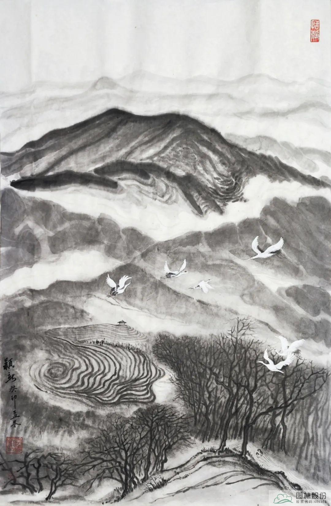 其中,杭州市園林綠化股份有限公司辦公室主任李穎新以徑山美景為創(chuàng)作內(nèi)容的書畫作品成功入選前20名。作品以杭州徑山及國家級美麗休閑鄉(xiāng)村-小古城村的自然景觀、鄉(xiāng)村風情、茶園風貌、翩翩白鷺等作為創(chuàng)作素材,主要表達在新時代背景下,隨著鄉(xiāng)村振興戰(zhàn)略的全面推進,一幅幅人與自然和諧共生的美麗畫卷正在神州大地徐徐展現(xiàn)。圖中山巒起伏、云霧氤氳、茶園連綿、溪水潺潺、白鷺紛飛……共同繪就一幅意境唯美的鄉(xiāng)村風情畫卷,留下一段令人念念不忘的鄉(xiāng)愁記憶。