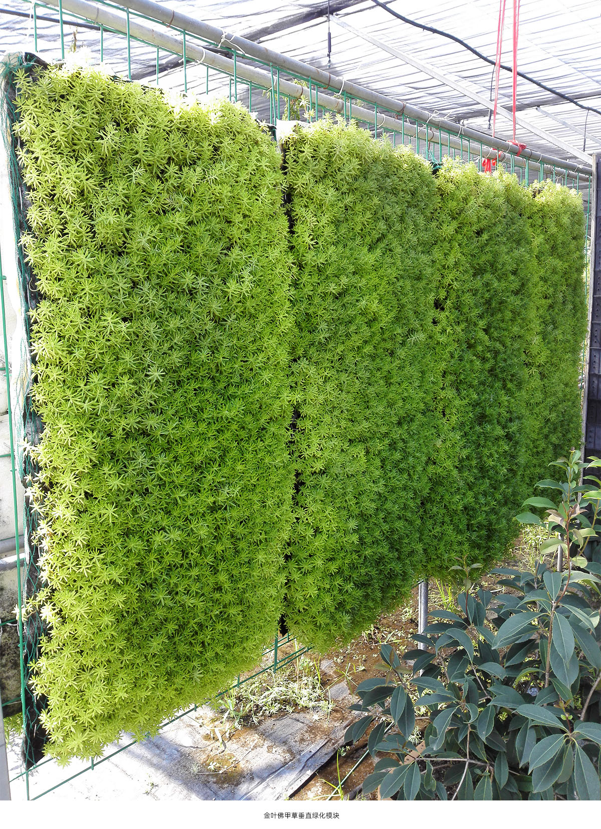 利用土工布、巖棉剪裁成一定規(guī)格與金葉佛甲草相結合,并運用工程技術,制作出四季便攜式、輕型、降溫的金葉佛甲草垂直模塊。達到立竿見影的景觀效果且生產(chǎn)周期短的目的,有利于大規(guī)模推廣運用。